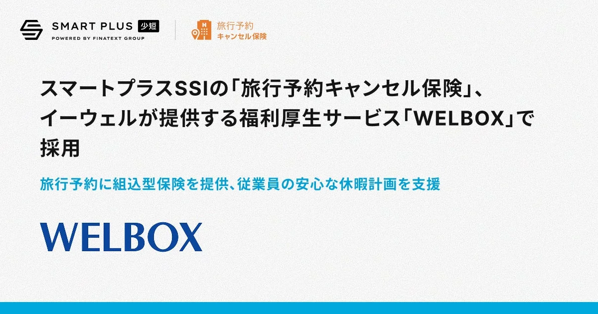 Finatextグループのスマートプラス少額短期保険株式会社(以下「スマートプラスSSI」)は、サービス組込型の「旅行予約キャンセル保険」が、株式会社イーウェル(以下「イーウェル」)が提供する福利厚生サービス「WELBOX(ウェルボックス)」にて採用されたことを発表しました。