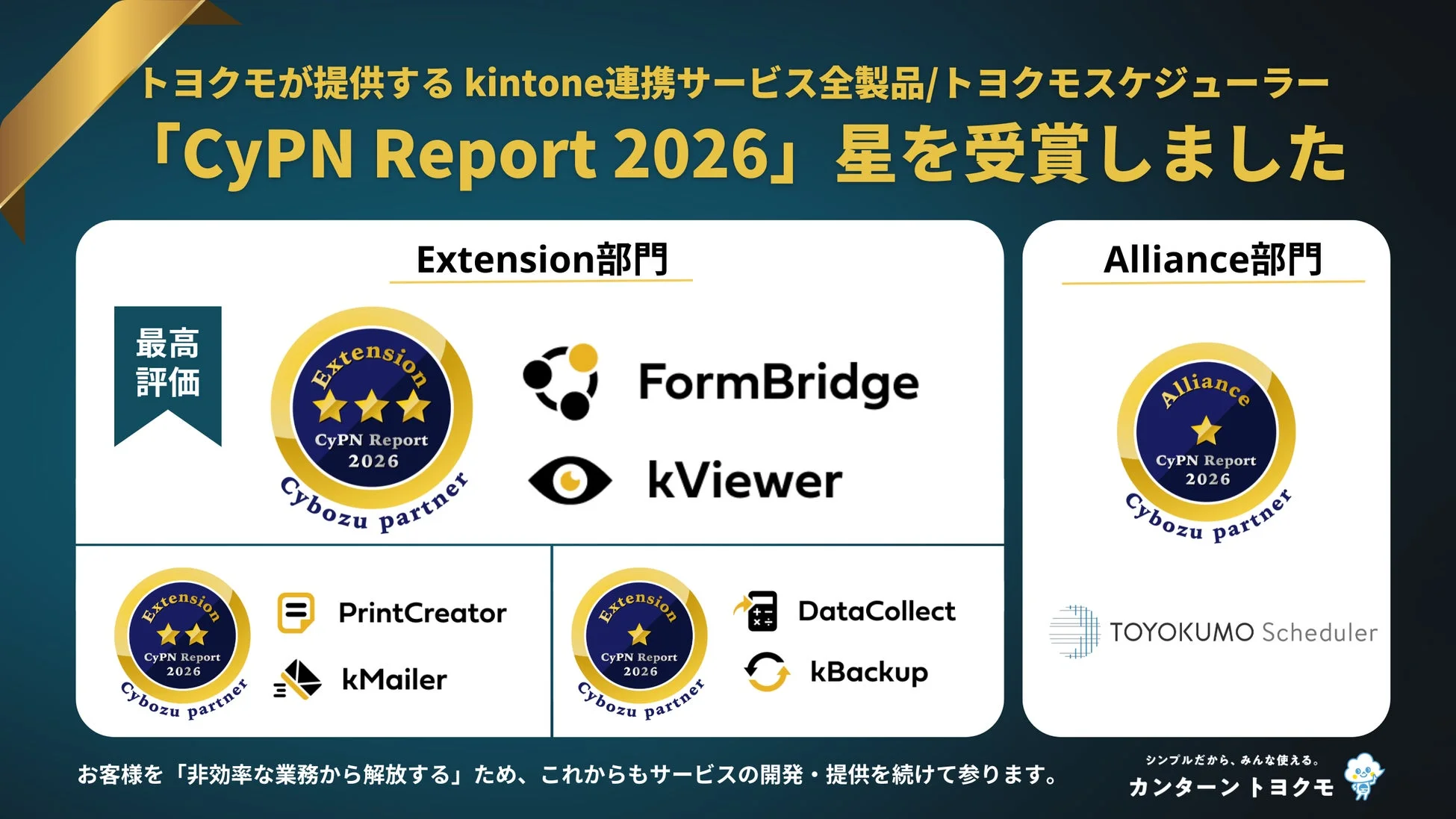 トヨクモは、「シンプルだから、みんな使える。カンターン トヨクモ」を掲げ、クラウドを使ったテクノロジーとアイデアで、誰でも簡単に使えるクラウドサービスを提供しています。kintone連携サービスは、社内でのkintone活用に加え、社外とのやり取りにおいてもお客様を「非効率な業務から解放する」ことを目指し、今後もサービスの開発・提供を続けていくとしています。
