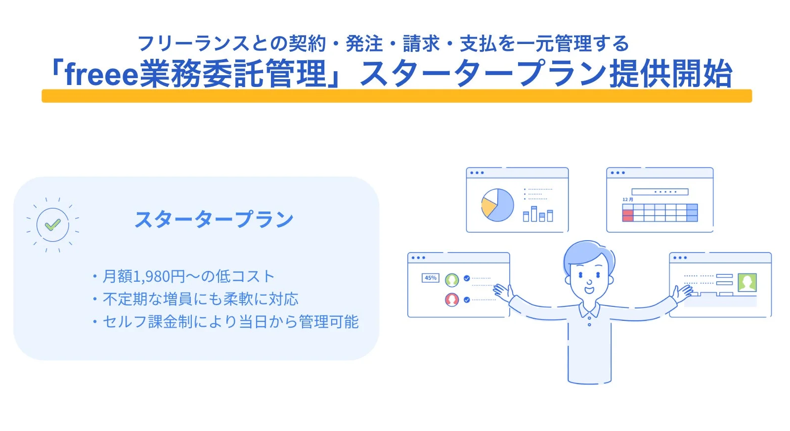 freeeは、このような課題を解決するため、業務委託が増え始めた段階の事業者が無理なくシステムを導入・運用できる環境の整備を目指し、今回のスタータープラン提供に至りました。