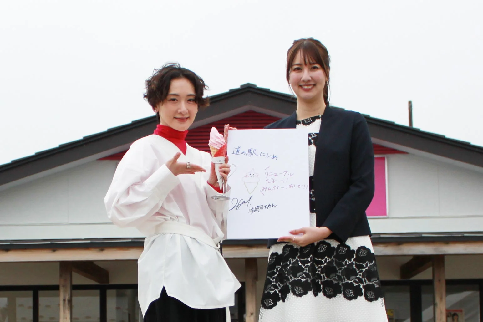 その後のトークライブでは、今回のリニューアルの目玉の一つである、生駒里奈さん自身が描き下ろした「特製ソフトクリームスリーブ」が披露されました。このスリーブは、「道の駅にしめ はまなすの里」にちなみ、はまなすの花のような紫がかったピンク色をテーマにデザインされています。この特製スリーブは、新たにオープンした「ミルクカフェ NISHIME」にて、「はまなすミルクソフトクリーム」を購入すると数量限定で提供されます。