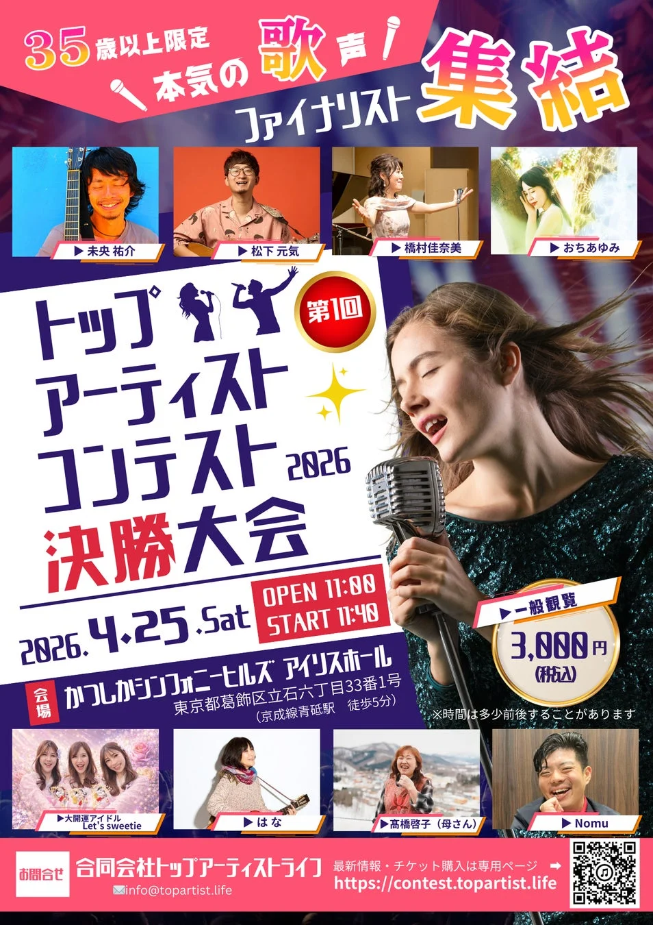 2026年4月25日(土)、東京都葛飾区にある葛飾シンフォニーヒルズ アイリスホールにて、35歳以上のシンガーに限定した音楽イベント「トップアーティストコンテスト2026」の決勝大会が開催されます。このコンテストは、「本気で生きると決めた大人たちのステージ」をテーマに、年齢や環境を理由に自身の可能性を制限してきた大人たちが、それぞれの人生から生まれた想いを歌に込めて“誰かに届ける”という本気の挑戦を描くイベントです。