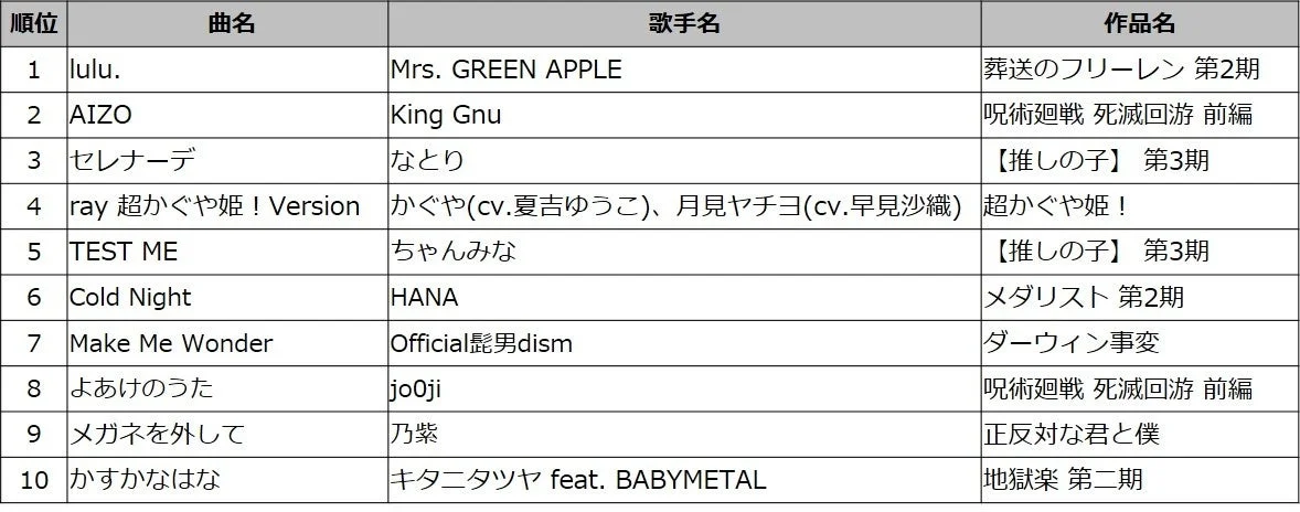 今回の調査で、栄えある1位に輝いたのは、Mrs. GREEN APPLEが担当した『葬送のフリーレン 第2期』オープニングテーマ「lulu.」でした。2位にはKing Gnuの「AIZO」、3位にはなとりの「セレナーデ」が続く結果となりました。