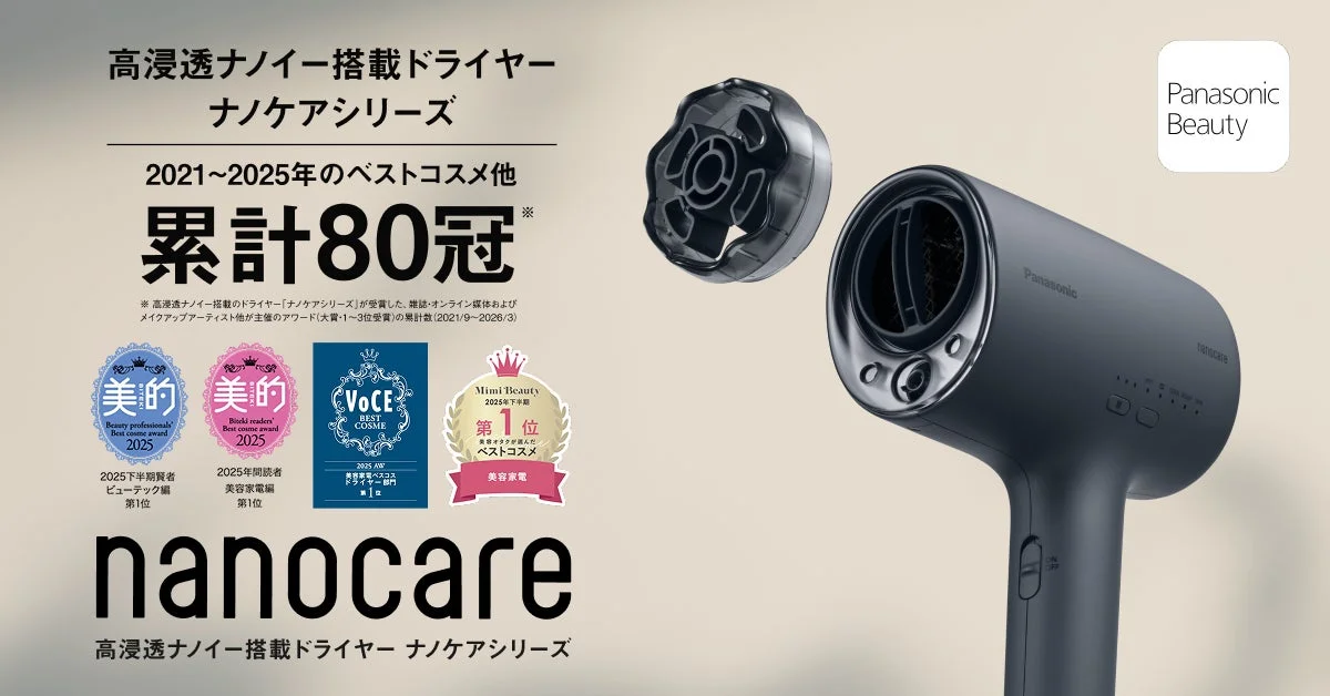 ※1:高浸透ナノイー搭載のドライヤー「ナノケアシリーズ」が、2021年9月から2026年3月までに、雑誌やオンライン媒体、メイクアップアーティストなどが主催するアワードで獲得した大賞・1~3位・受賞の累計数です。