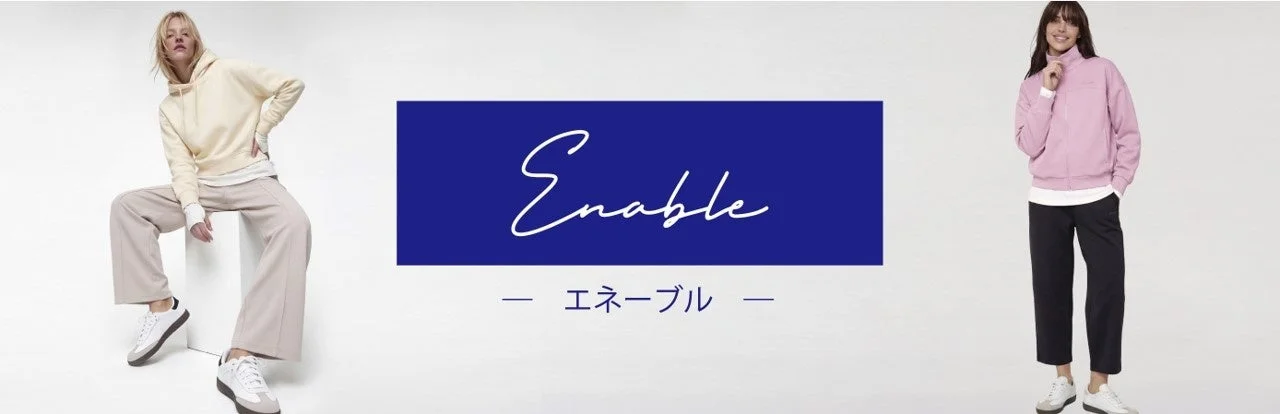 「Enable(エネーブル)」は、「毎日のあらゆる瞬間が心地よくつながるように。しなやかに伸びて、やさしくフィットして、気持ちを自然に整えてくれる。スポーツでもファッションでもない、“ライフアクティブ”という新しい選択肢。ちょうど良い心地よさが、あなたの毎日を軽くする。」をコンセプトに掲げています。日常に自然と馴染むデザインと動きやすさを兼ね備え、リラックスタイムからちょっとした外出、軽いアクティビティまで、幅広いシーンで活用できる商品が揃っています。