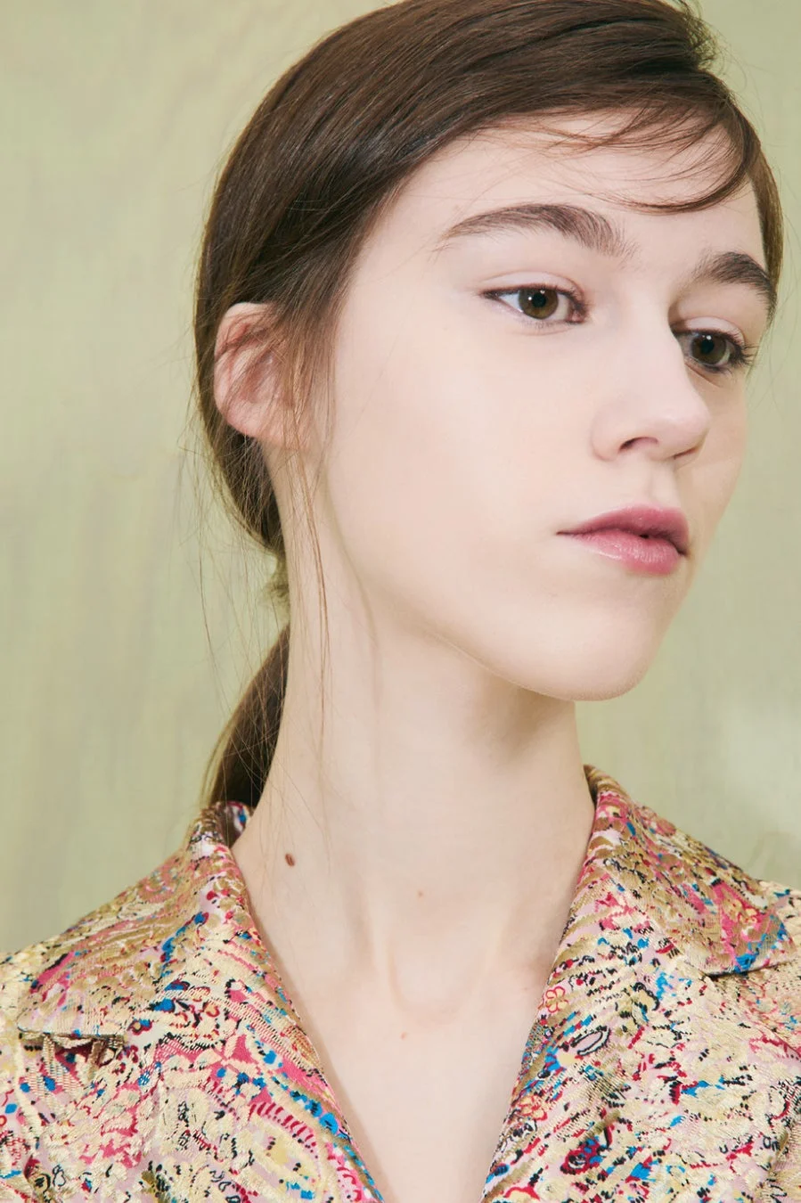 ヘアスタイルは、サイドパートの無造作なポニーテールで、すっきりとしつつも抜け感のあるスタイルが採用されています。