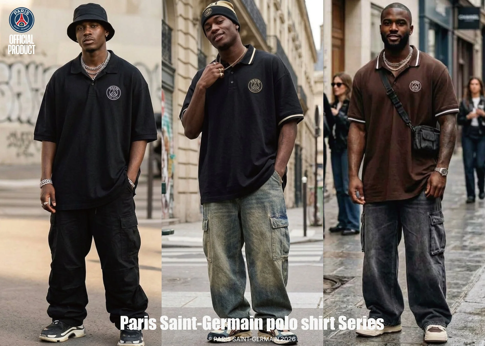 パリ・サンジェルマンのポロシャツシリーズを着用した3人の男性モデル