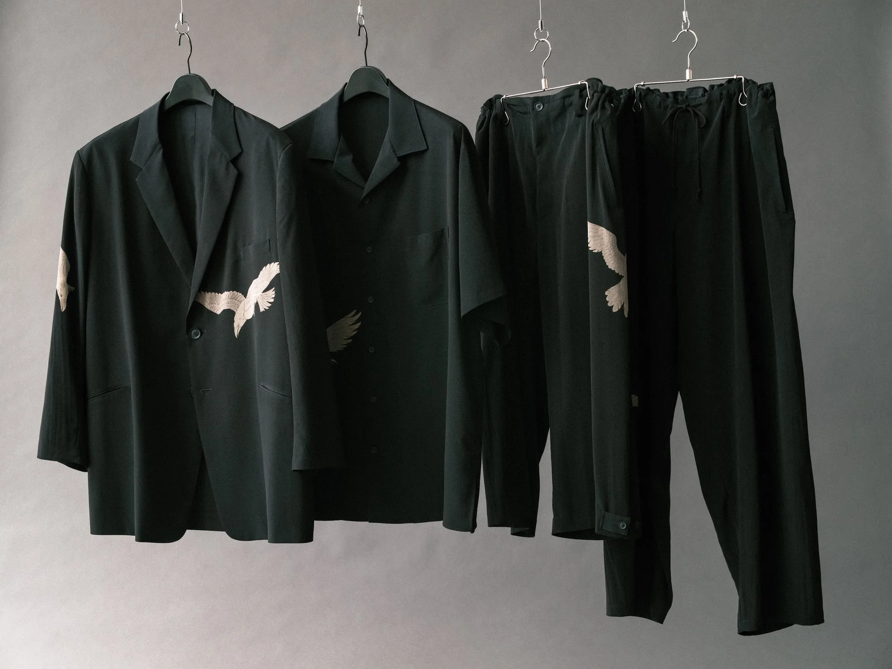 今回のPOP-UP STOREでは、2011-12AWコレクションに初めて登場して以来、ブランドの象徴的なモチーフとして繰り返し描かれてきた「カラス」がテーマとなっています。今回は、定番素材であるトリアセテート・ポリエステルのタキシード生地に、抜染プリントという手法を用いてカラスのモチーフが施されています。