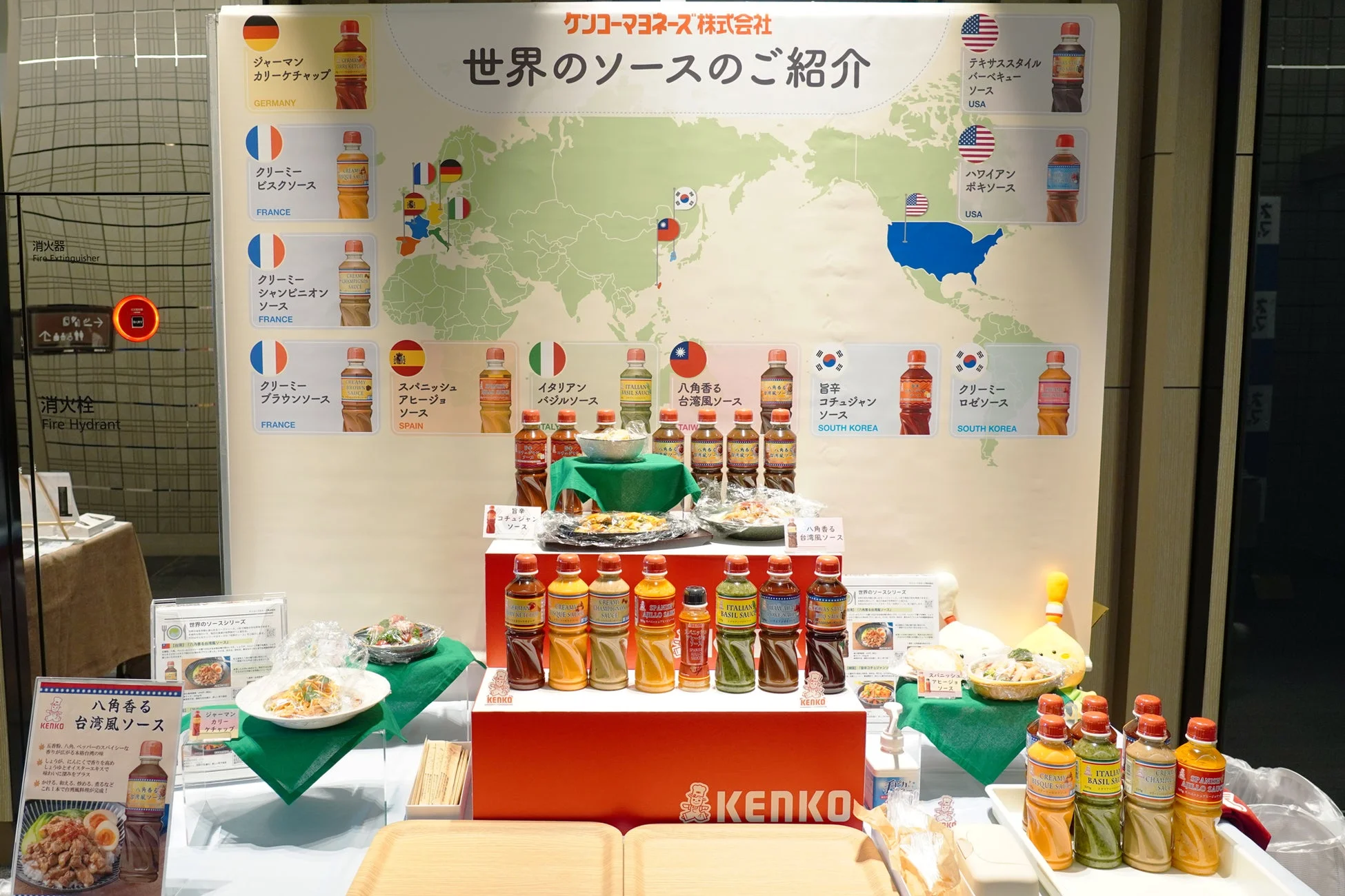 発表会では、『八角香る台湾風ソース』のほか、同じアジアの韓国の味わいをもとに開発された『旨辛コチュジャンソース』も試食・展示されました。さらに、「世界のソース」シリーズで人気の『スパニッシュアヒージョソース』、『ジャーマンカリーケチャップ』、『イタリアンバジルソース』のメニュー見本も展示され、来場したメディア関係者は気になる商品の味を試していました。