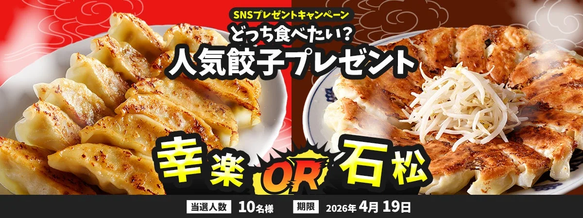 • プレゼント商品: 「幸楽」または「石松」の餃子(いずれか1種類)を計10名にプレゼント