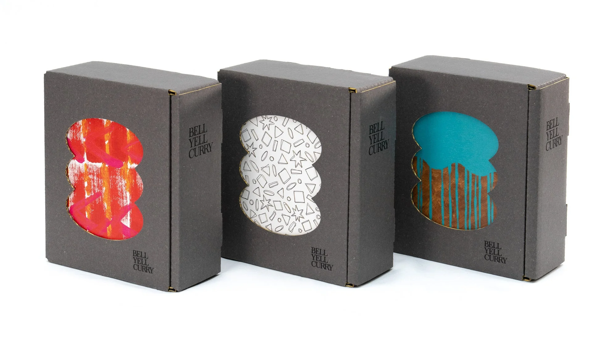 今回のギフトセットには、「BELL YELL CURRY」スープカレー全3種が収まる専用のクラフト紙製ギフトボックスが付属します。このボックスは、落ち着いたマットグレーの本体正面に、「BELL YELL CURRY」のアイコンである「折り重なったカレー皿」の形状がダイカットで施されています。さらに、裁断面には蛍光イエローが彩色されており、まるで額縁のようにパッケージのアート作品を美しく引き立てます。