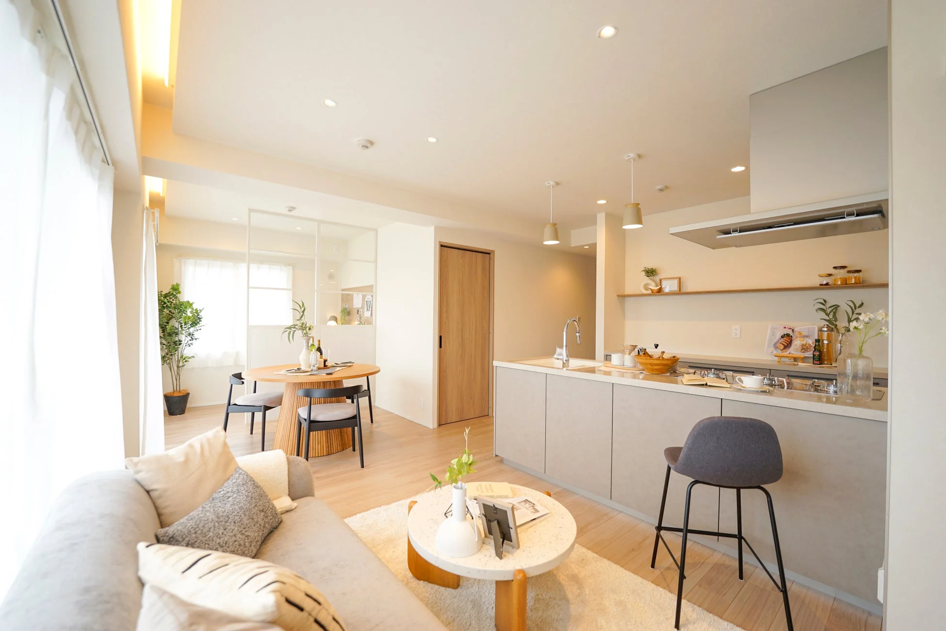 LDKに隣接するワークスペースは、あえて壁を作らず「ベリティス しきり窓」を用いて空間をゆるやかに区切っています。視線が通り抜けるため、家族の気配を感じながら作業に集中できる設計です。将来は、お子様のスタディースペースとして、リビングから見守ることも可能でしょう。