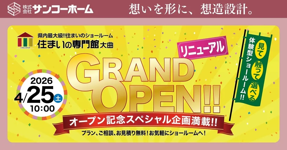 株式会社サンコーホームは、17年連続で秋田県No.1の年間新築住宅着工棟数を誇る地域密着型のビルダーです。創業90年の歴史を持ち、宮大工の技術と現代の新技術・新材料を組み合わせることで、耐震性、耐久性、省エネルギー性に優れたデザイン性の高い住宅を提供しています。最長60年の長期保証や、秋田の気候に合わせた全館冷暖房ダブル空気清浄システムの採用など、お客様に寄り添った住まいづくりを大切にしています。社名には「お客様の幸せ」「社員の幸せ」「会社の幸せ」という“三つの幸せ”を実現したいという想いが込められています。