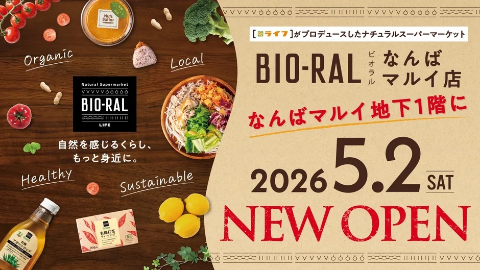 2026年5月2日(土)、大阪の主要な繁華街である「なんば」エリアに、ナチュラルスーパーマーケット「ビオラルなんばマルイ店」がオープンします。大阪メトロ御堂筋線「なんば」駅に直結する「なんばマルイ」の地下1階に位置し、アクセスしやすい立地が特徴です。