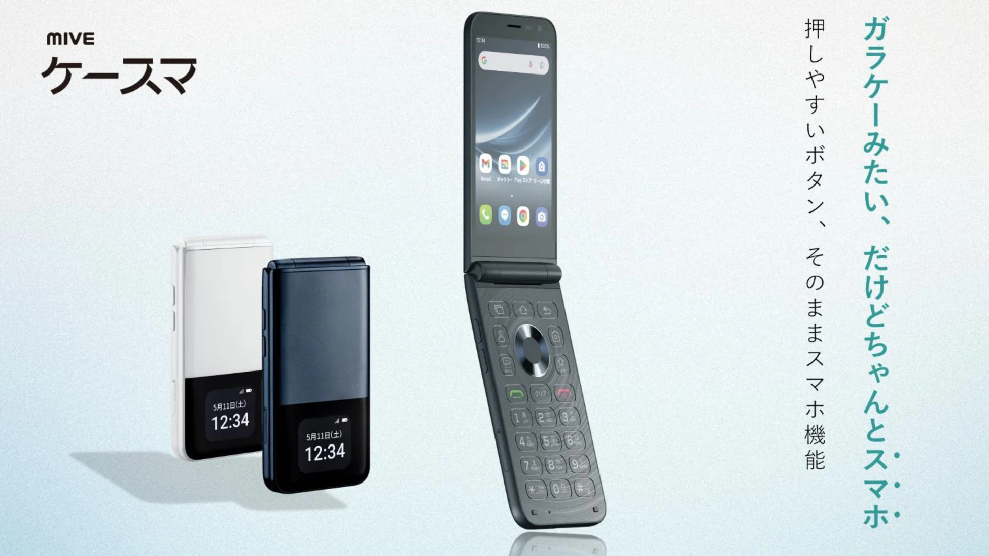 「MIVEケースマ」はAndroid 14 Go Editionを搭載し、Google Playに対応しています。物理キーとタッチパネルの双方で操作が可能です。また、日本語入力IME、防塵防水機能、音声通知、SOS機能など、シニアユーザーの利用を意識した機能が充実しています。