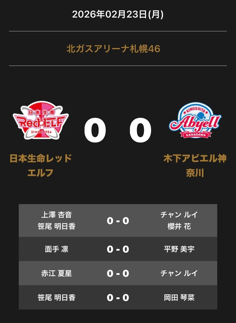 2026年2月23日(月)に開催されるノジマTリーグ 2025-2026シーズン公式戦、「日本生命レッドエルフ vs 木下アビエル神奈川」の対戦オーダーが発表されました。