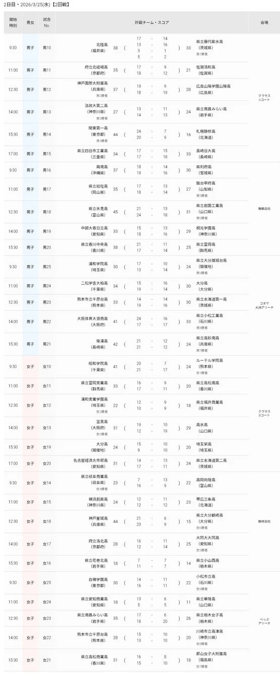 2026年3月25日(水)、「第49回全国高等学校ハンドボール選抜大会」の競技2日目が行われ、男女合わせて計16試合が実施されました。この結果、2回戦の全試合が終了し、男女それぞれでベスト16のチームが出そろいました。