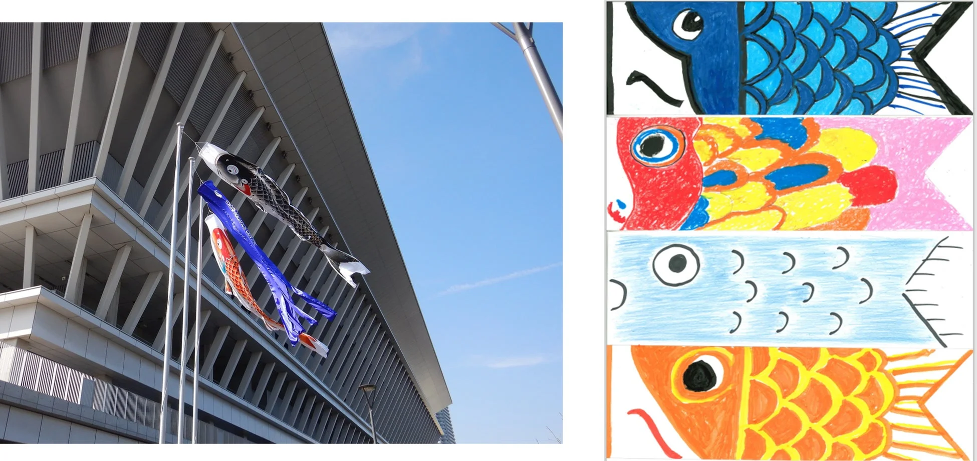 期間中、東京アクアティクスセンターのダイナミックな外観を背景に、長さ5mの大きなこいのぼりと、東京アクアティクスセンターのロゴ入りオリジナル吹き流しが空を悠々と泳ぎ、訪れる人々を出迎えます。
