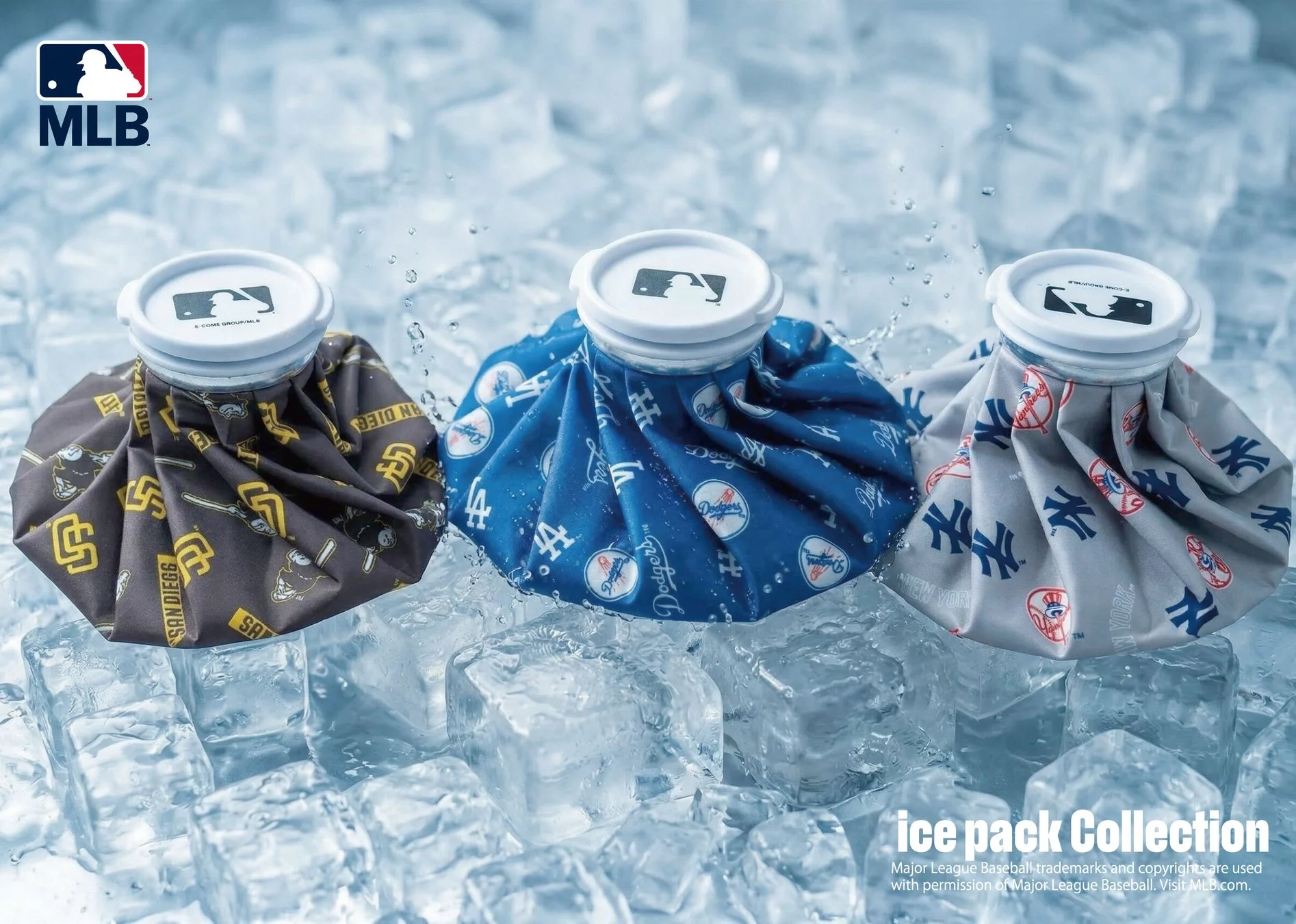 今回登場する氷嚢は、世界的な人気を誇る「ロサンゼルス・ドジャース」「サンディエゴ・パドレス」「ニューヨーク・ヤンキース」の3球団が対象です。各球団のチームカラーをベースに、象徴的なロゴが総柄やワンポイントで配置されており、機能性だけでなくファッション性の高さも魅力となっています。