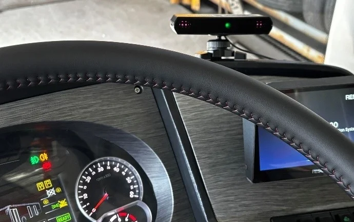 車内に設置された「Smart Eye AIS」は、運転操作への影響を抑えながらドライバーの状態を常時モニタリングすることで、安全運行を支援します。