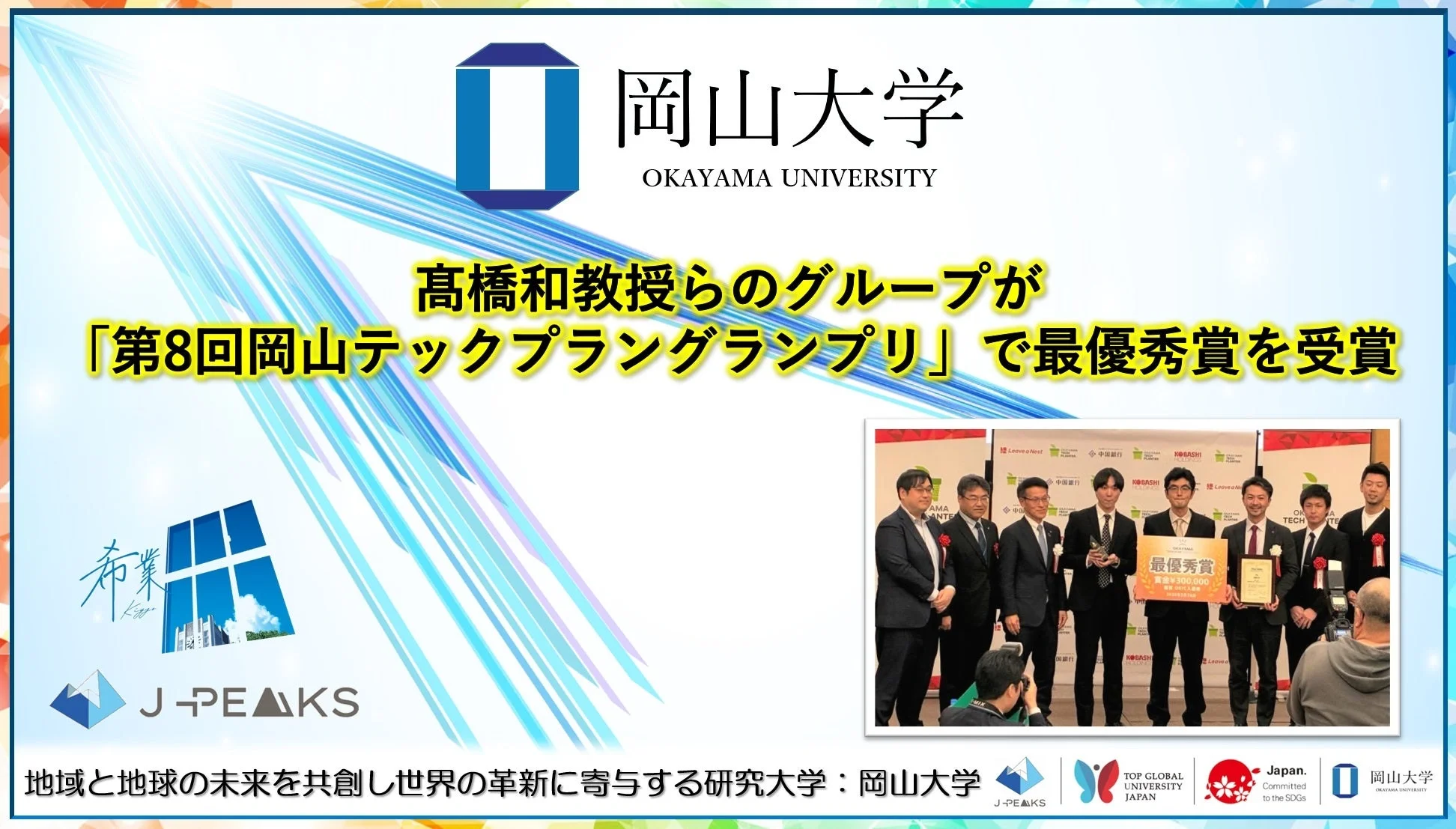 岡山テックプラングランプリは、地域発の技術を基盤とした新規事業の創出とベンチャーの育成・支援を通じて、大学や研究機関から生まれた研究成果の社会実装を促進し、地域産業を育む新たなエコシステムの構築を目指すものです。岡山大学関係者が最優秀賞を含む複数の賞を受賞したことは、同大学の研究成果が持つ事業化の可能性の高さを示しており、今後の大学発スタートアップ創出のさらなる進展が期待されます。