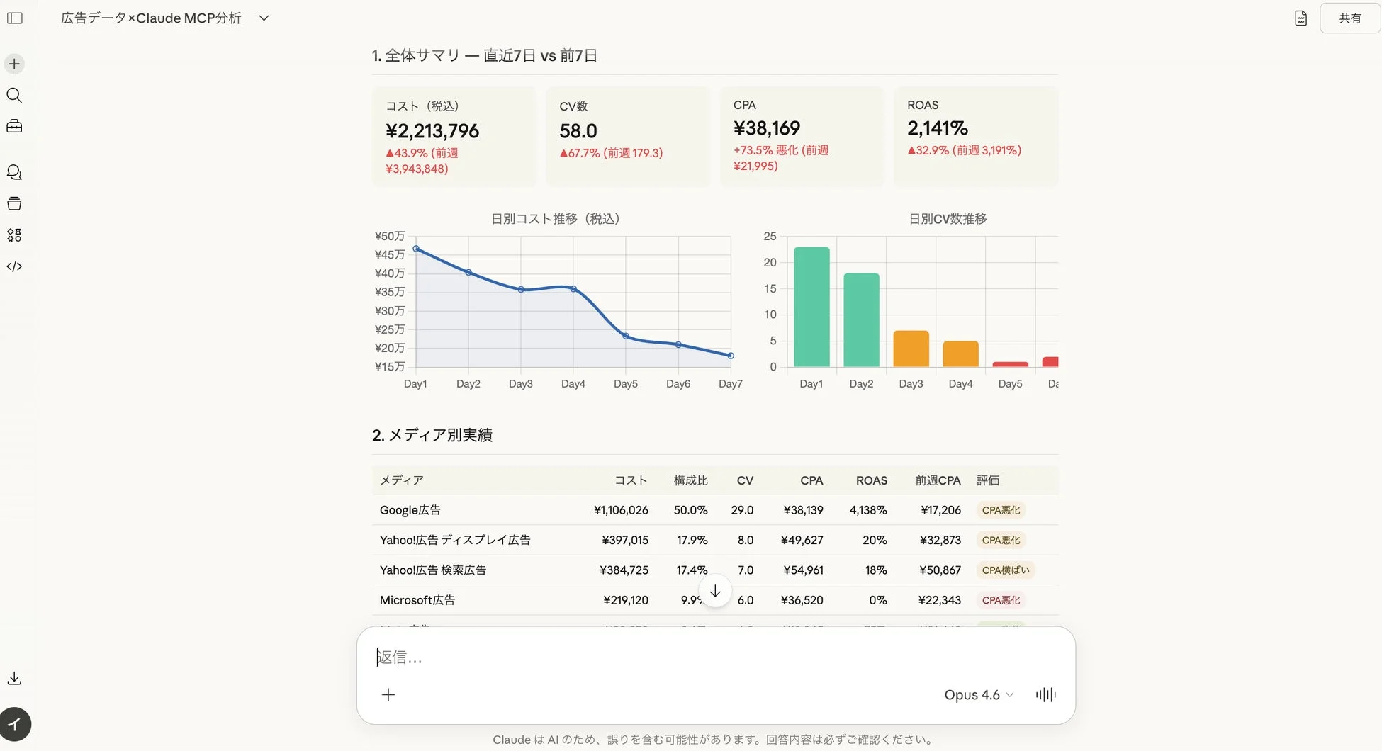 「先週のCPAが高かったキャンペーンは?」「CVRが改善傾向にあるキーワードを教えて」といった日本語での質問に対し、ClaudeがBigQueryの最新データを参照し、的確な回答やインサイトを提供します。