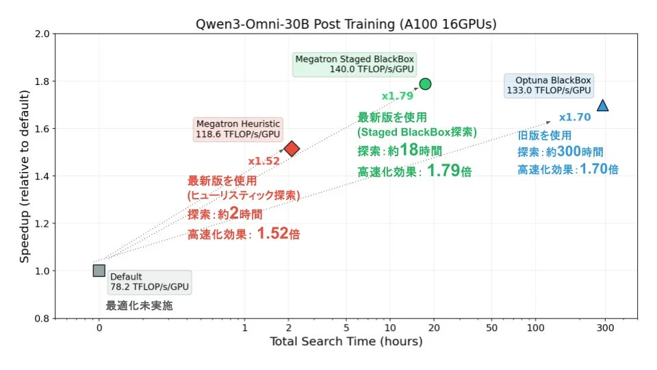 Staged BlackBox探索: 約18時間の探索でスループットを140.0 TFLOP/s/GPUまで引き上げ、約1.79倍の学習時間高速化を実現しました。従来のBlackBox最適化アルゴリズム(Optunaベース)と比較して、約1/16の探索時間でより優れたハイパーパラメータを取得できることが示されています。