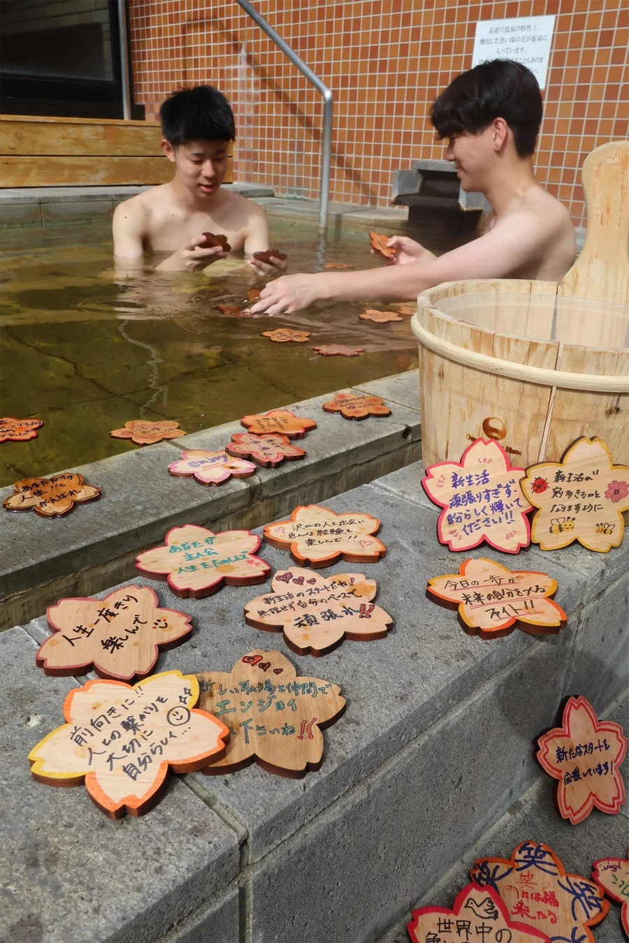 桜の形にカットされた100枚の入浴木には、スタッフが新生活を迎える方々へのメッセージを書き込み、湯船に浮かべられます。この入浴木の加工は、市内の木工施設「杉インテリア木工館」と連携して製作されており、地域の木工技術とゴルフ場、ホテルが連携したアップサイクルの取り組みとなっています。