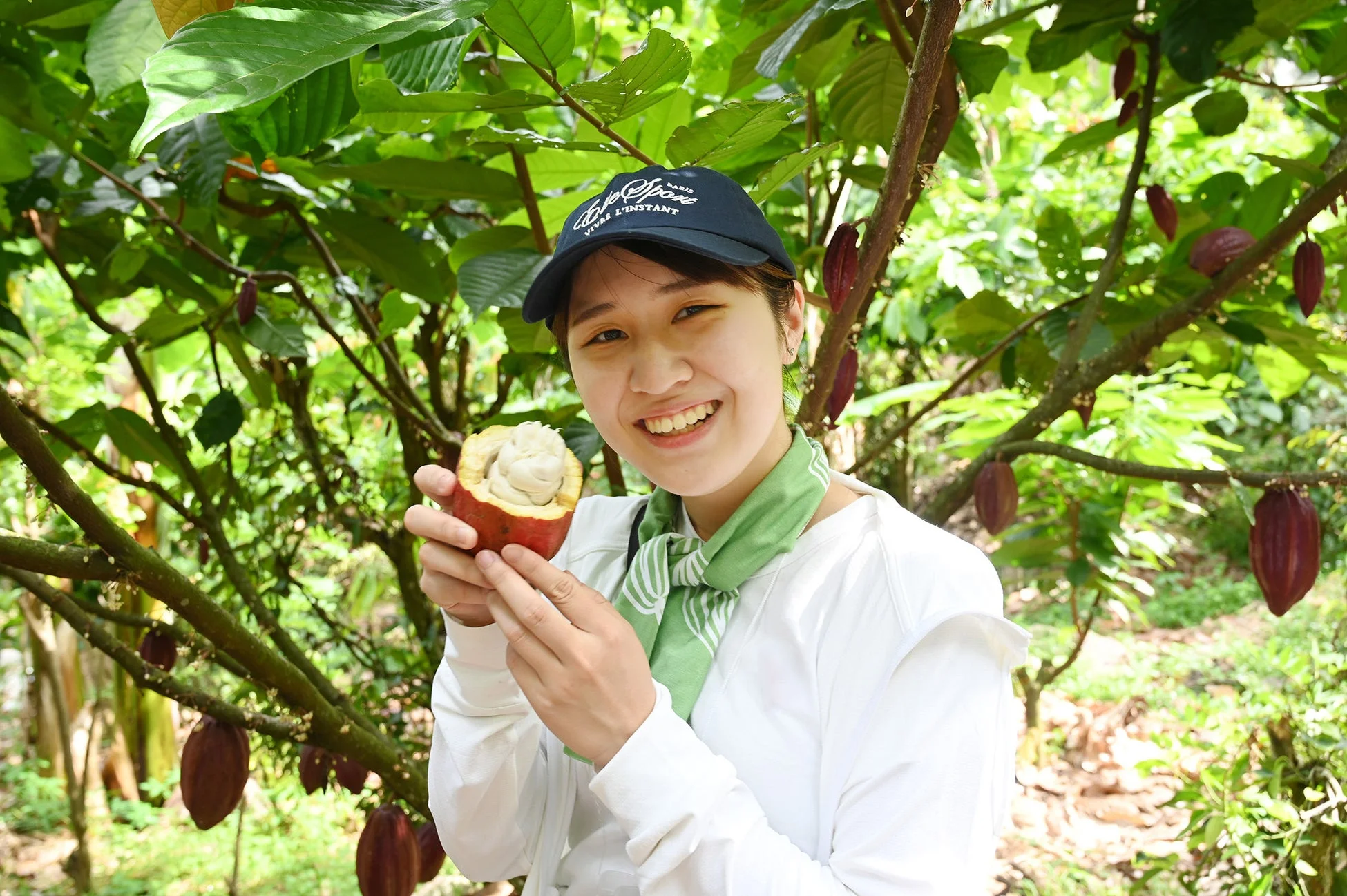 ツアーのハイライトの一つは、農園でカカオの実を収穫し、フレッシュなカカオの果実(カカオパルプ)をその場で味わう体験です。また、収穫後のカカオ豆が発酵する様子や、乾燥、選別といった一連の工程を見学できます。
