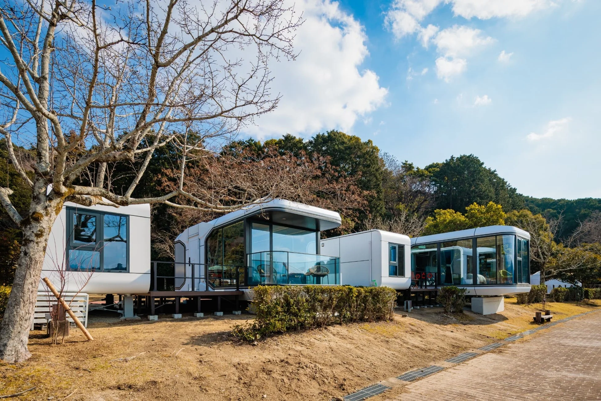 「ザ・グランスイート」は、国内でも珍しいサイズのカプセル宿泊棟で、これまでにない新しい宿泊スタイルを提供します。海と山がパノラマウィンドウいっぱいに広がり、自然との一体感を味わえる特別な空間です。シャワールーム、トイレ、BBQスペースも完備されており、快適な滞在を実現します。