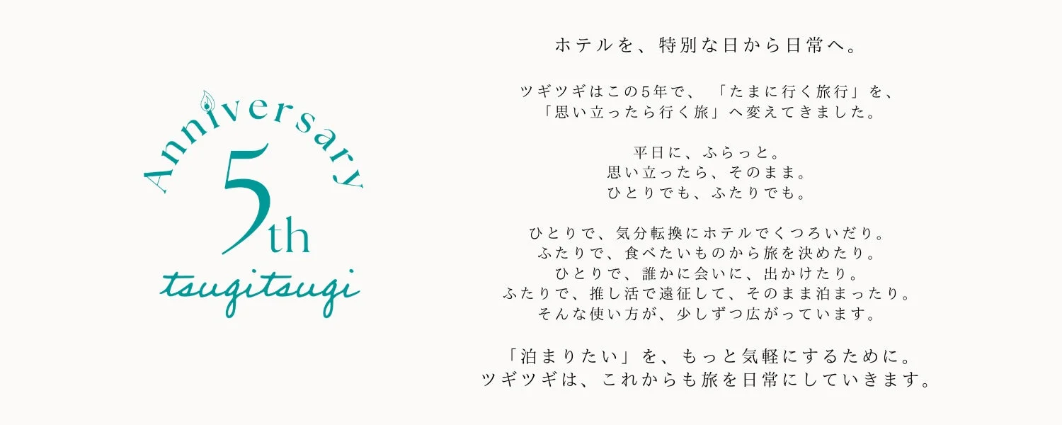 定額宿泊サービス「ツギツギ」が5周年記念キャンペーンを実施!1泊増量や1年分プレゼントなどお得な企画満載